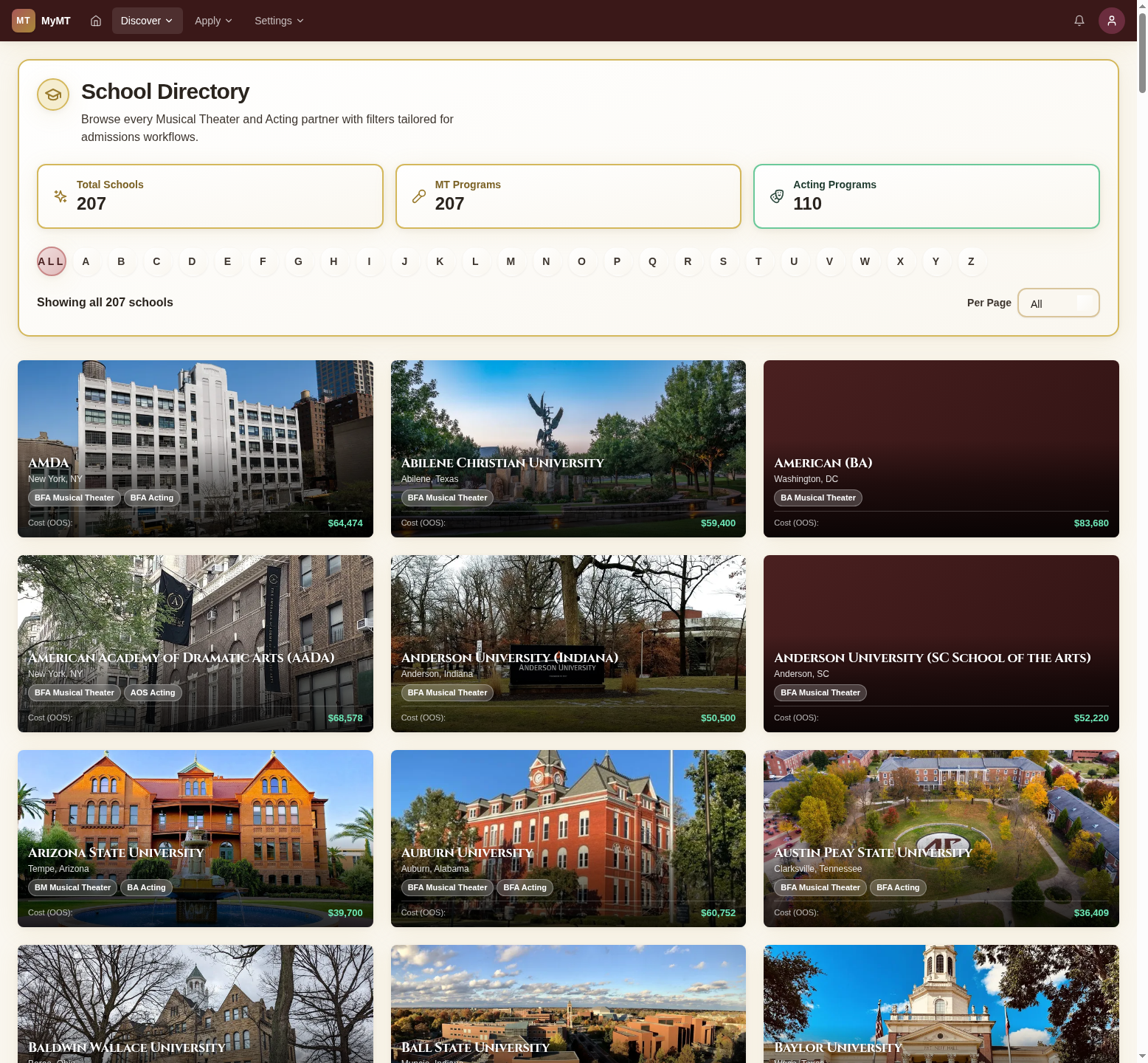 Explore over 200 BFA, BA, and BM musical theater and acting programs. View school cards with key details at a glance, then dive into full profiles with prescreen and audition requirements.