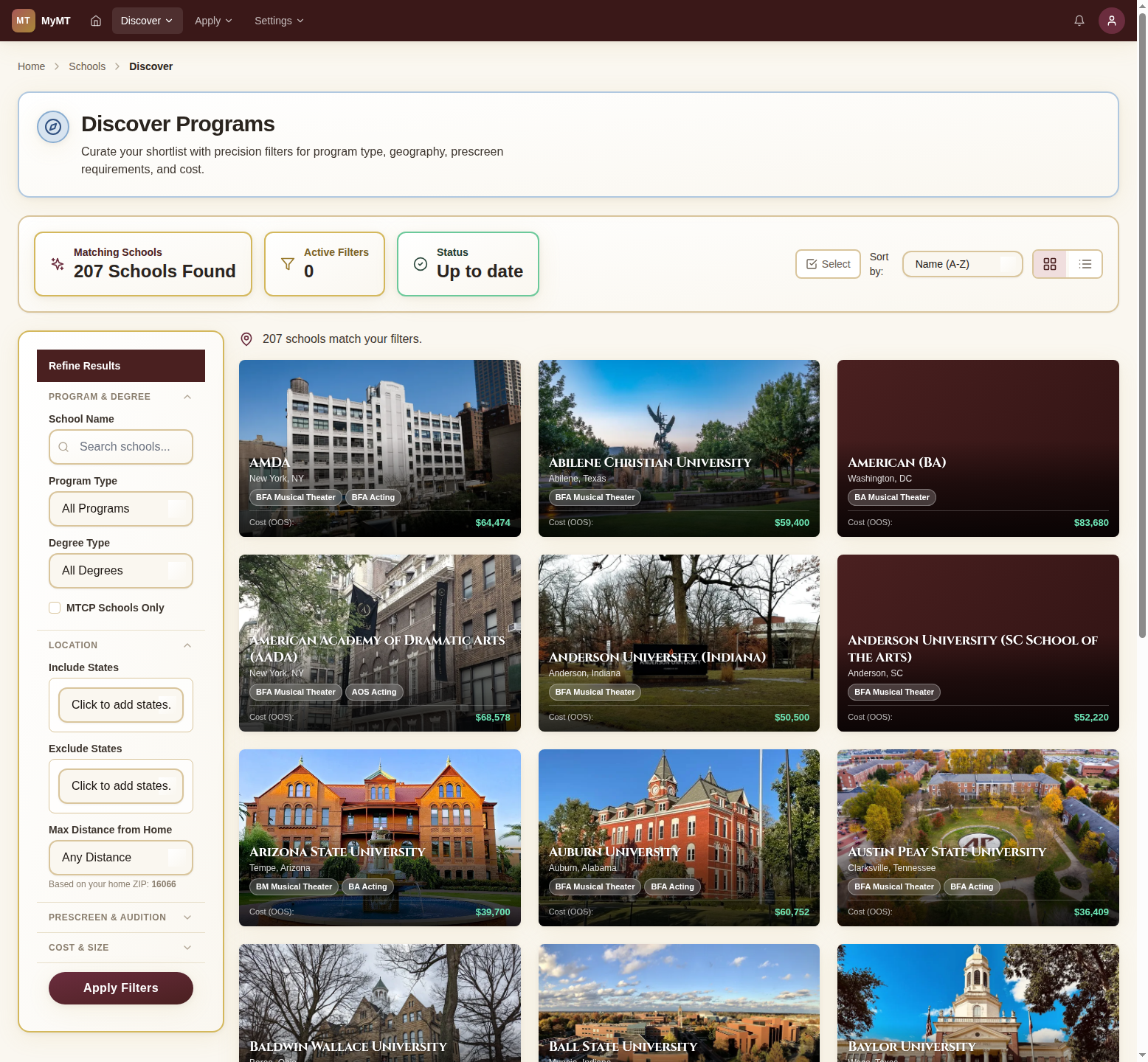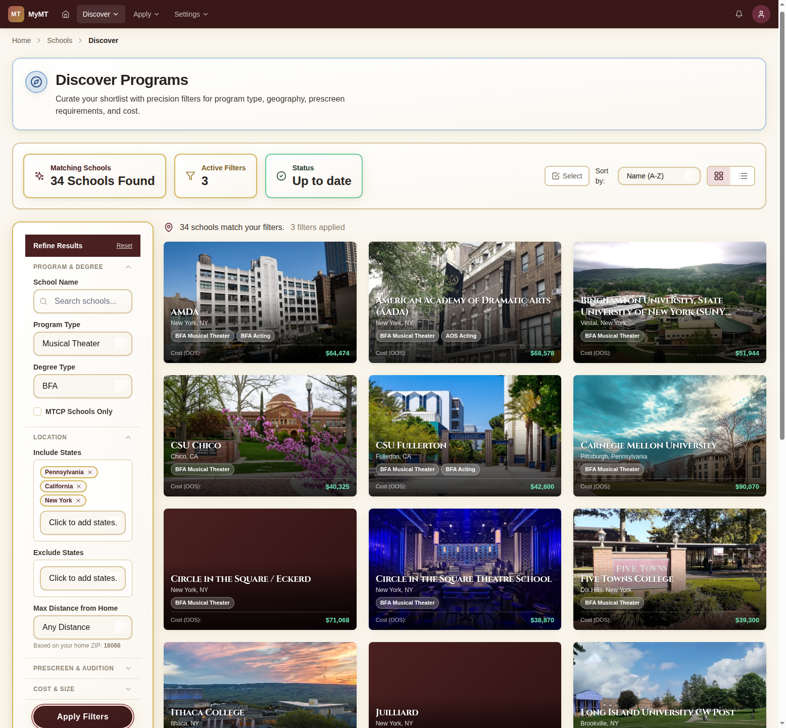 Use the Discover Programs page to narrow down schools by location, enrollment size, degree type, audition format, and more.