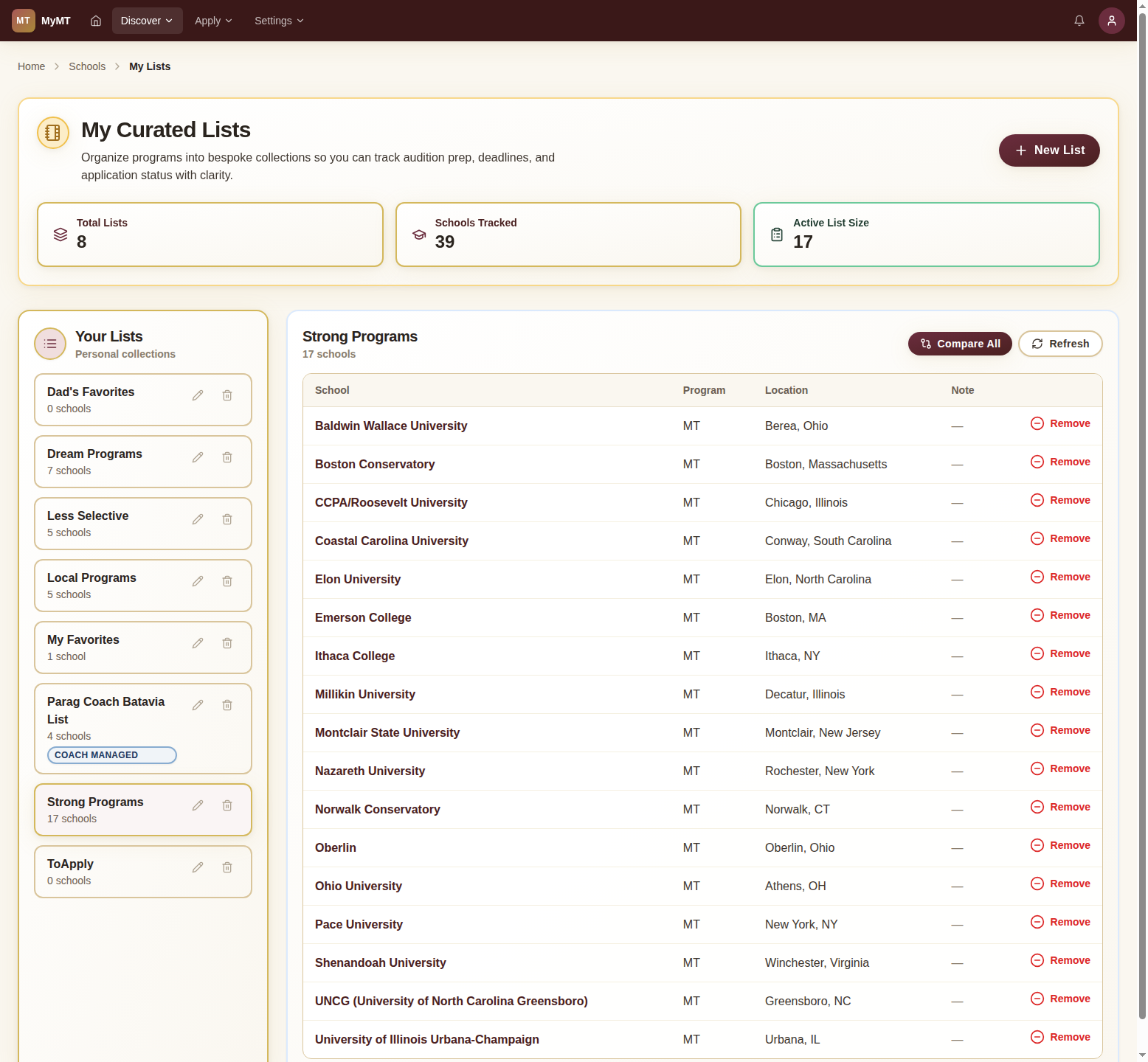Your lists appear in the left panel. Click any list to see its schools in the detail pane on the right, with program type, location, and a Compare All option.