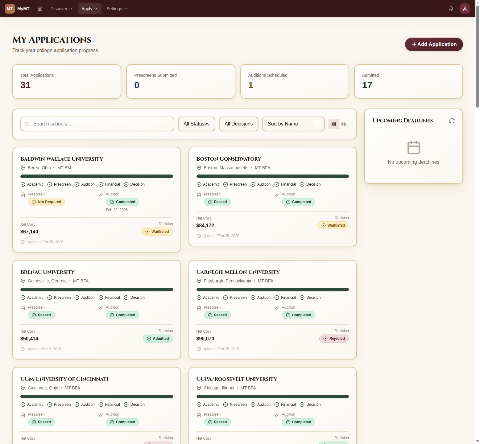 The application dashboard shows summary stats at the top — total applications, prescreens submitted, auditions scheduled, and admits. Each school appears as a card with its current status and progress.