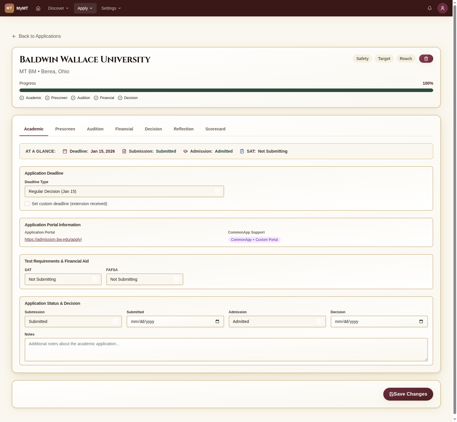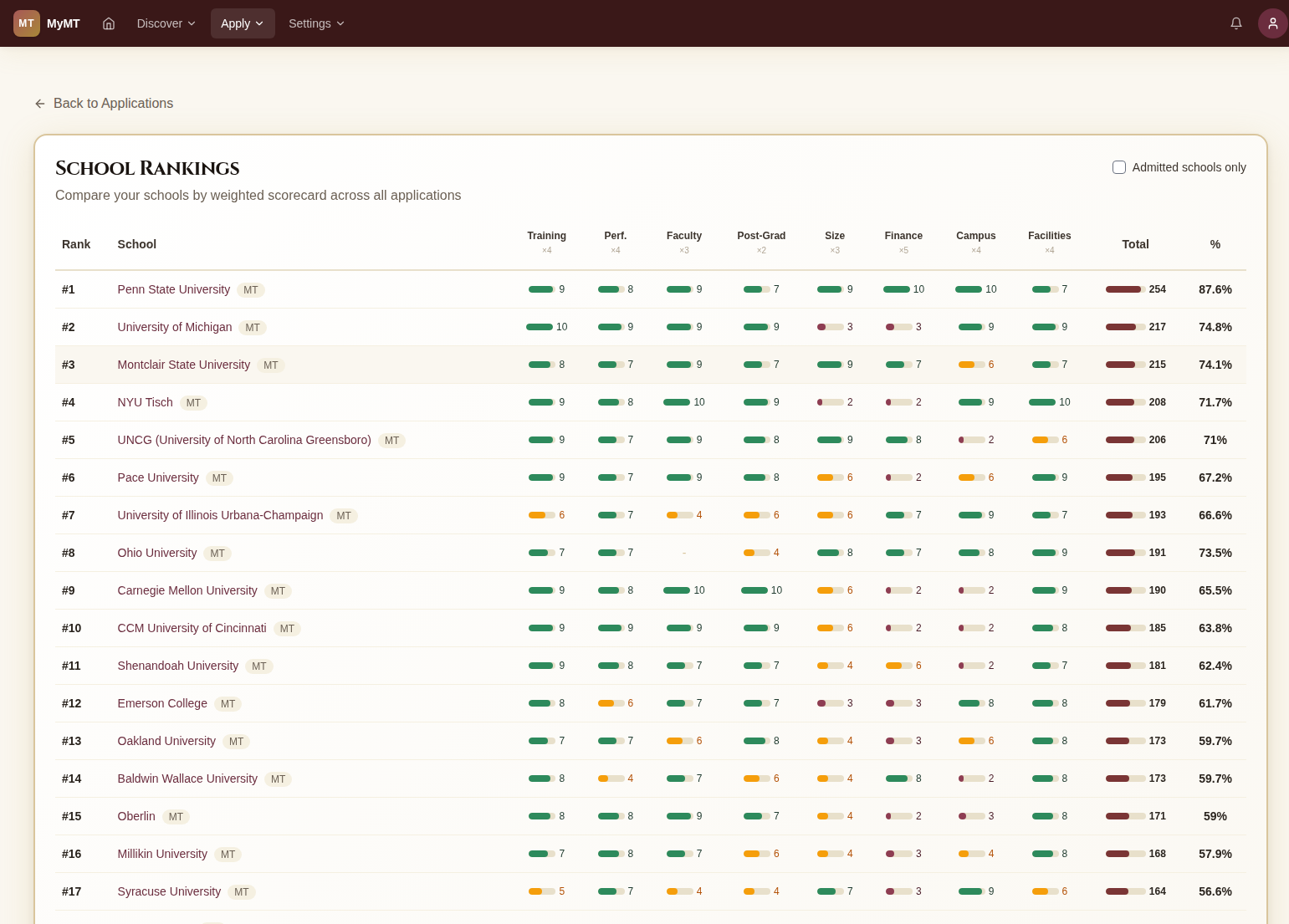Create an application dashboard to keep all your schools, deadlines, and statuses in one place. Never miss a prescreen deadline again.