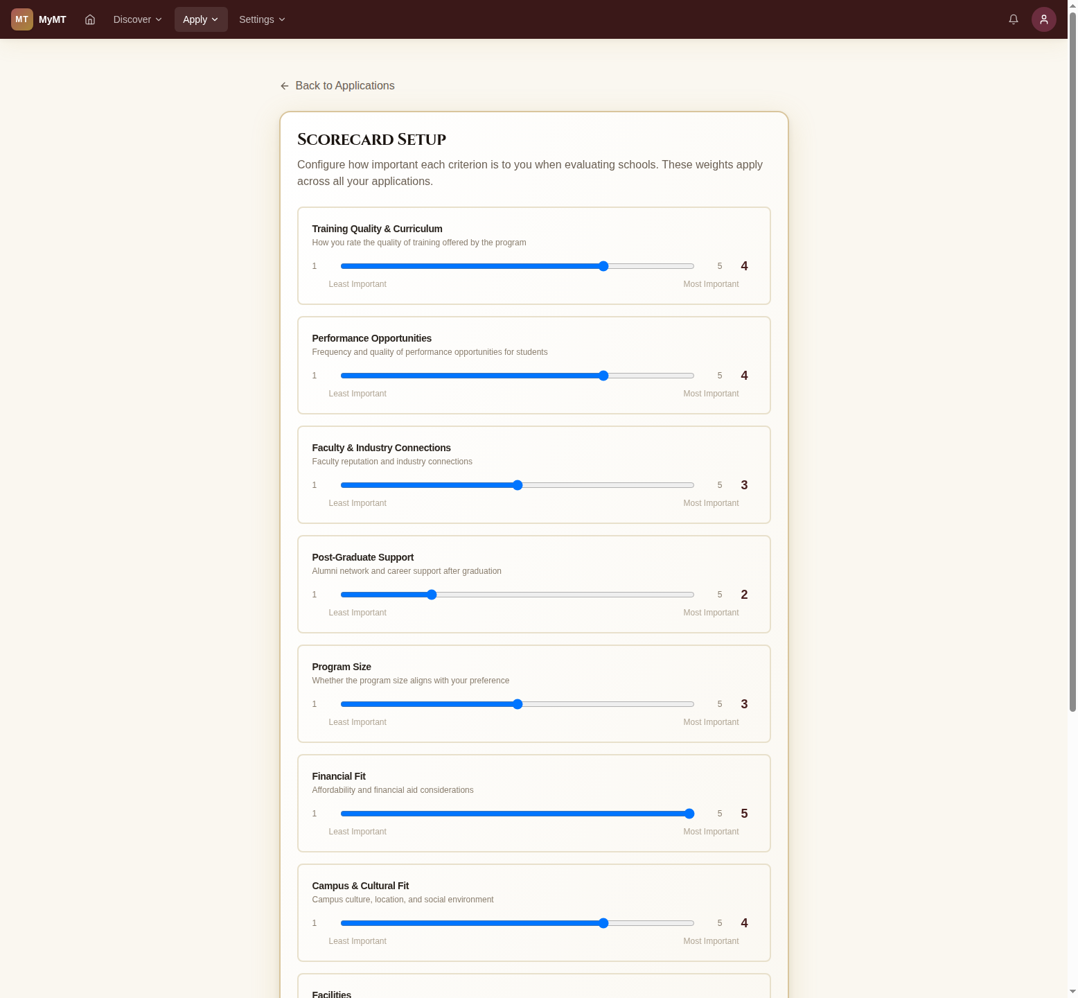 Start by defining what matters most. Use sliders to set importance weights for criteria like Training Quality, Performance Opportunities, Faculty, Post-Grad Support, and more.